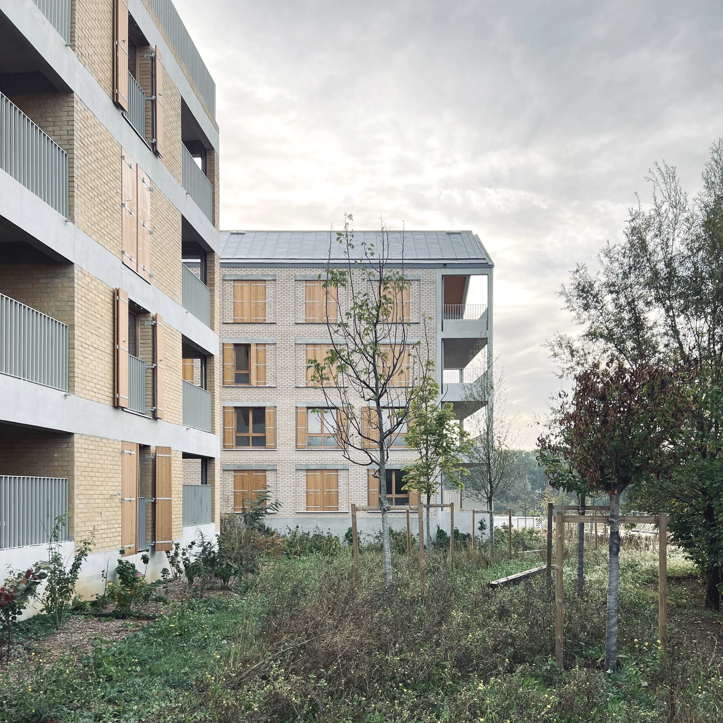 “ La dernière frange d’urbanisation possible au sud de Rungis s’installe en belvédère sur la plaine et favorise une couture en finesse entre des morceaux de villes urbanisés et le grand paysage : une nouvelle « lisière habitée » qui ménage des fenêtres sur la plaine à travers une épaisseur bâtie en assumant une certaine politesse à l’égard des milieux naturels. Les façades sont en brique pleine de terre cuite structurelle permettant de limiter le béton sur le projet.”