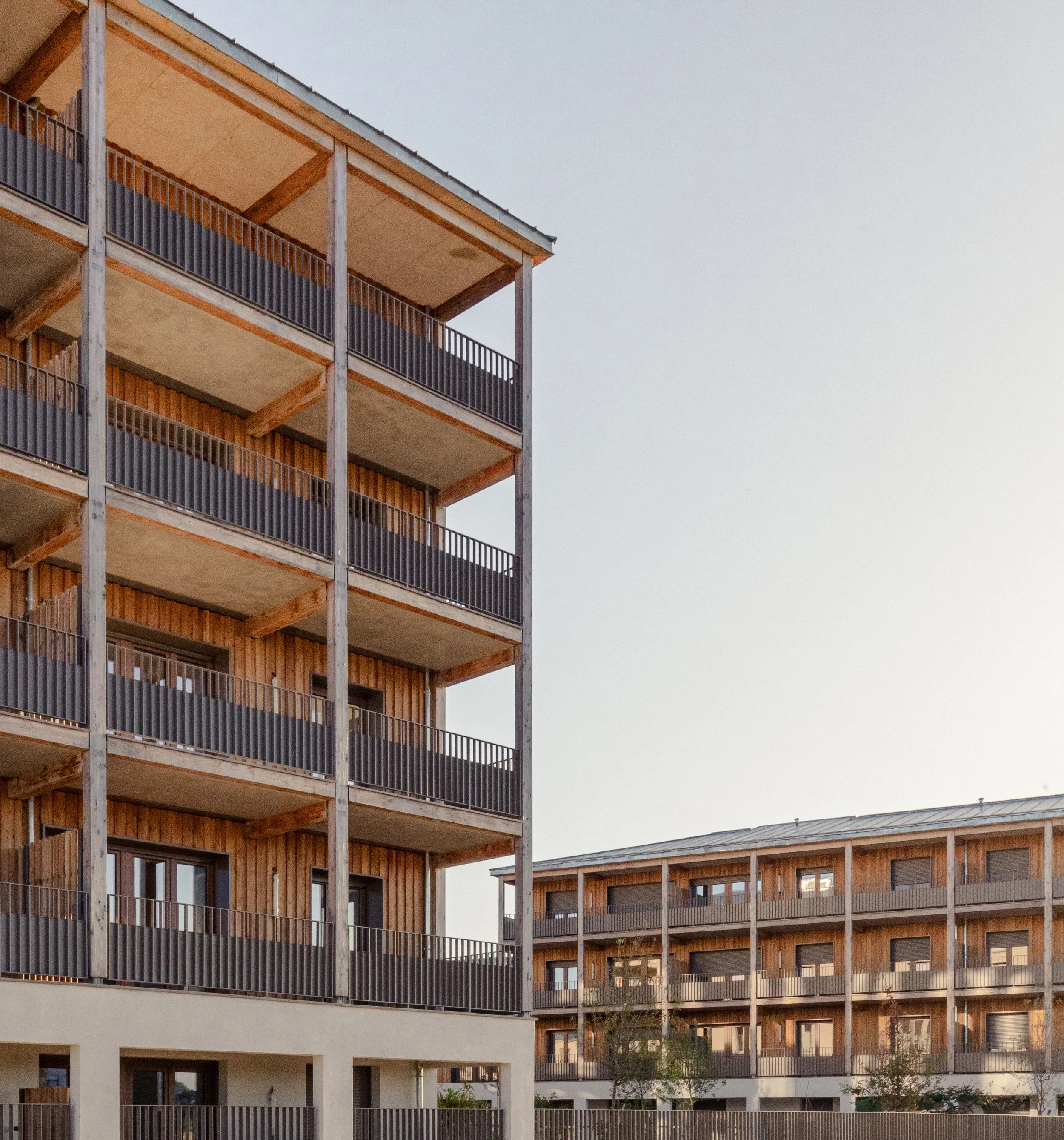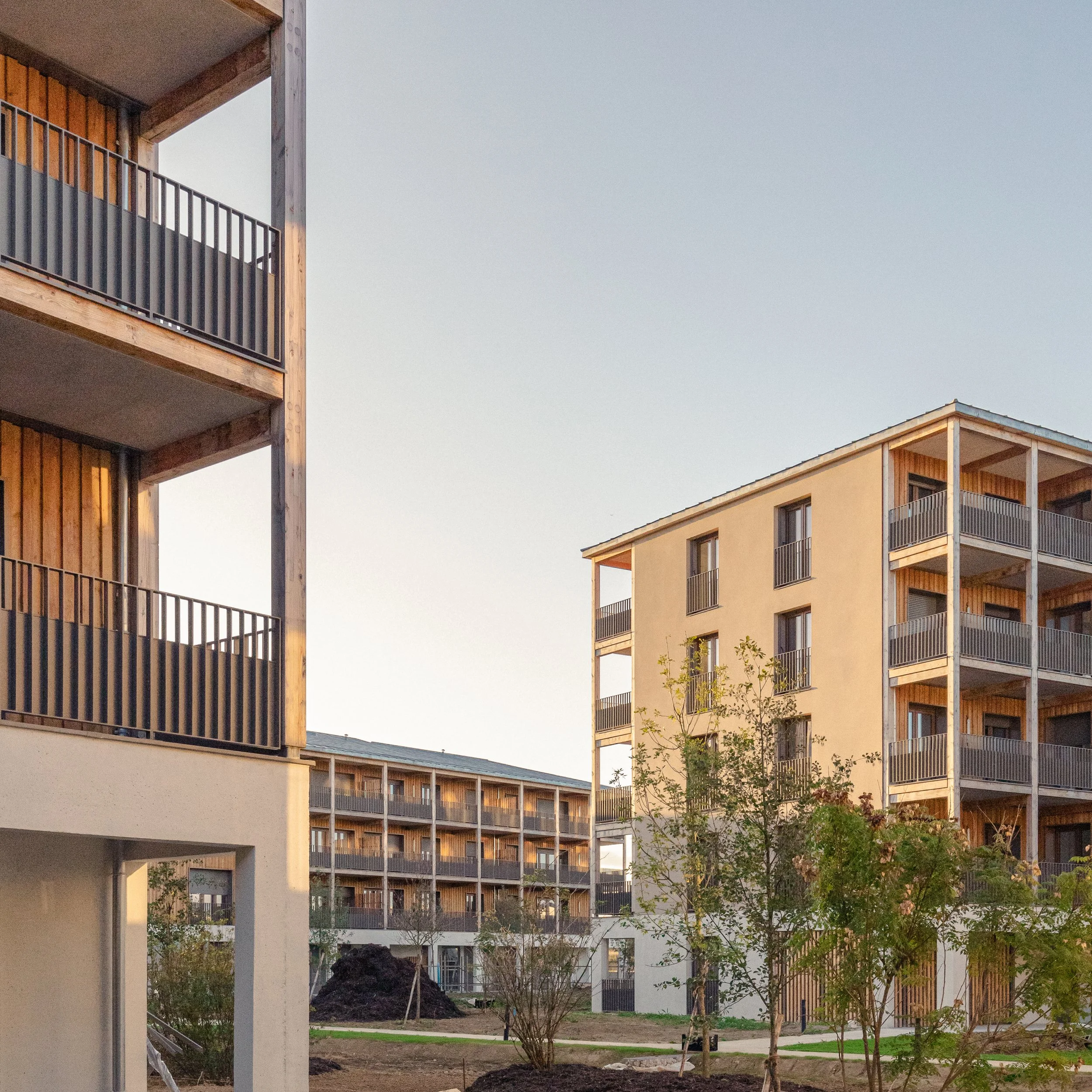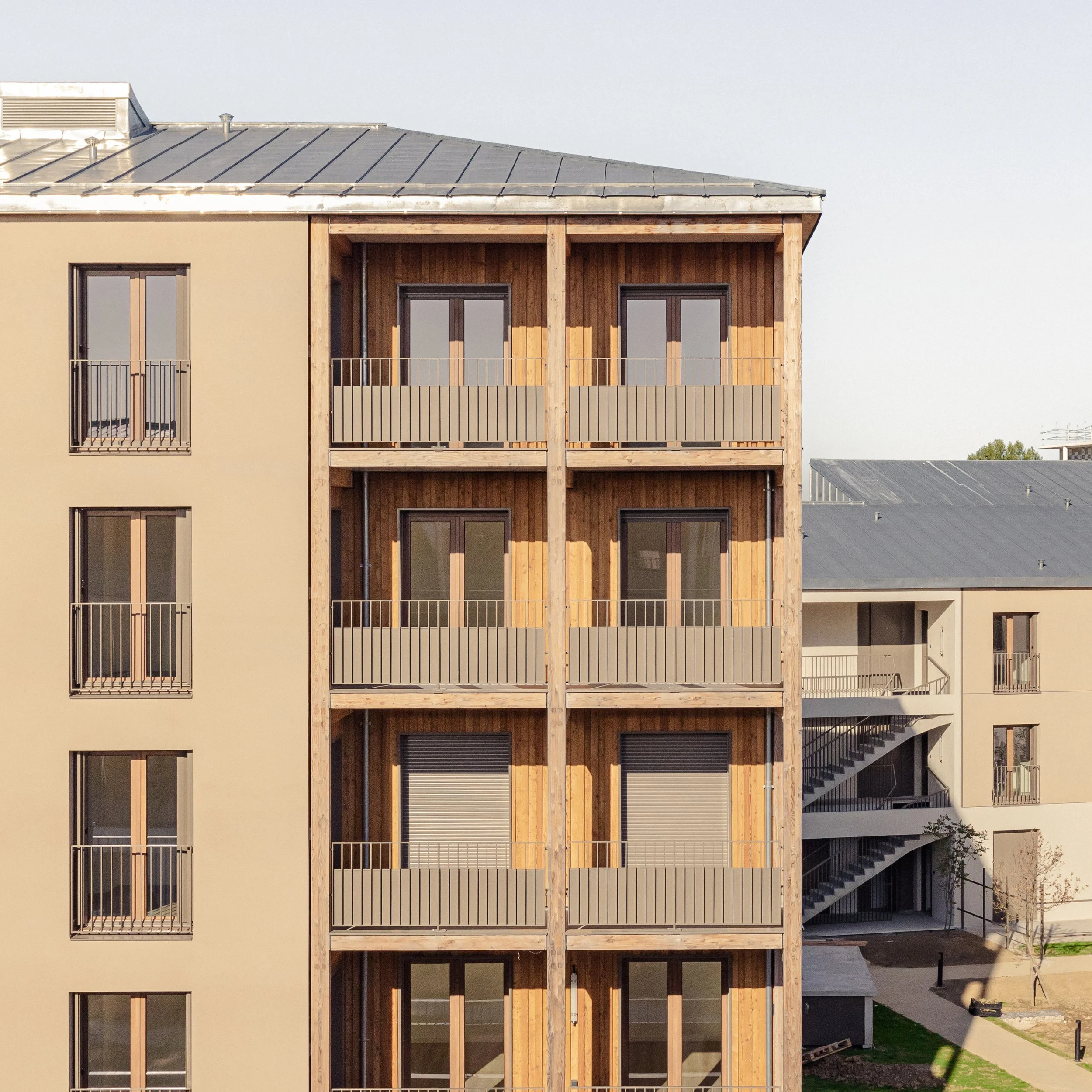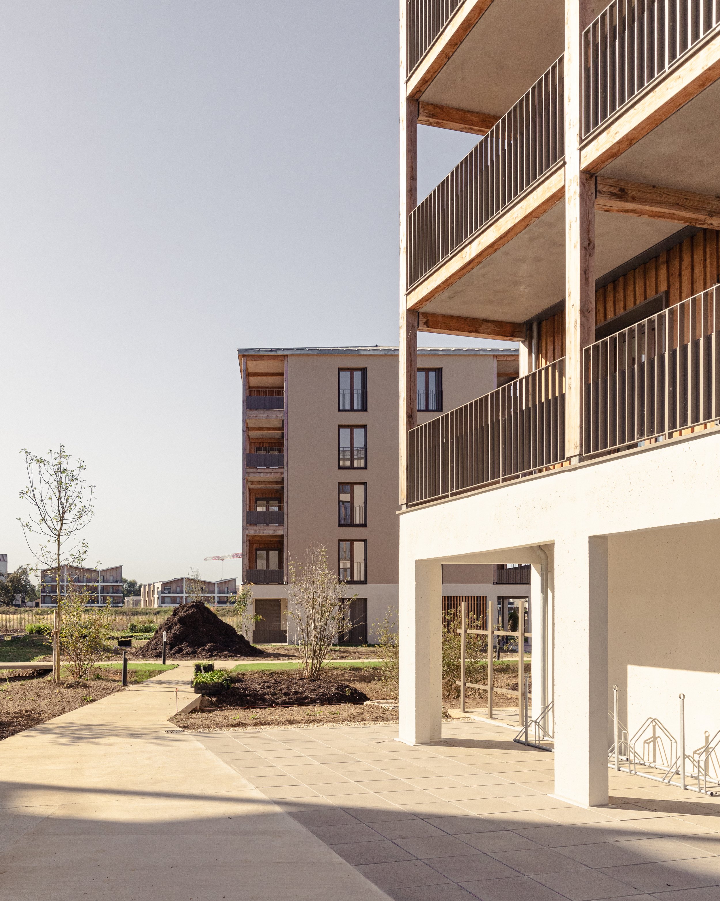 “ La conception des logements est guidée par les vues offertes sur ces grands espaces plantés à différentes échelles. Chaque logement possède un espace extérieur généreux d’au moins 15m². Un système de pièce de vie servante permet de supprimer les couloirs et d’offrir uniquement des m² utiles et habitables et des pièces de vies multi orientées et donc flexibles dans leurs utilisations. Le projet développe une identité architecturale à la fois domestique et unitaire pour l’ensemble des bâtiments aux hauteurs et échelles variées, organisée autour des espaces extérieurs en structure bois. ”