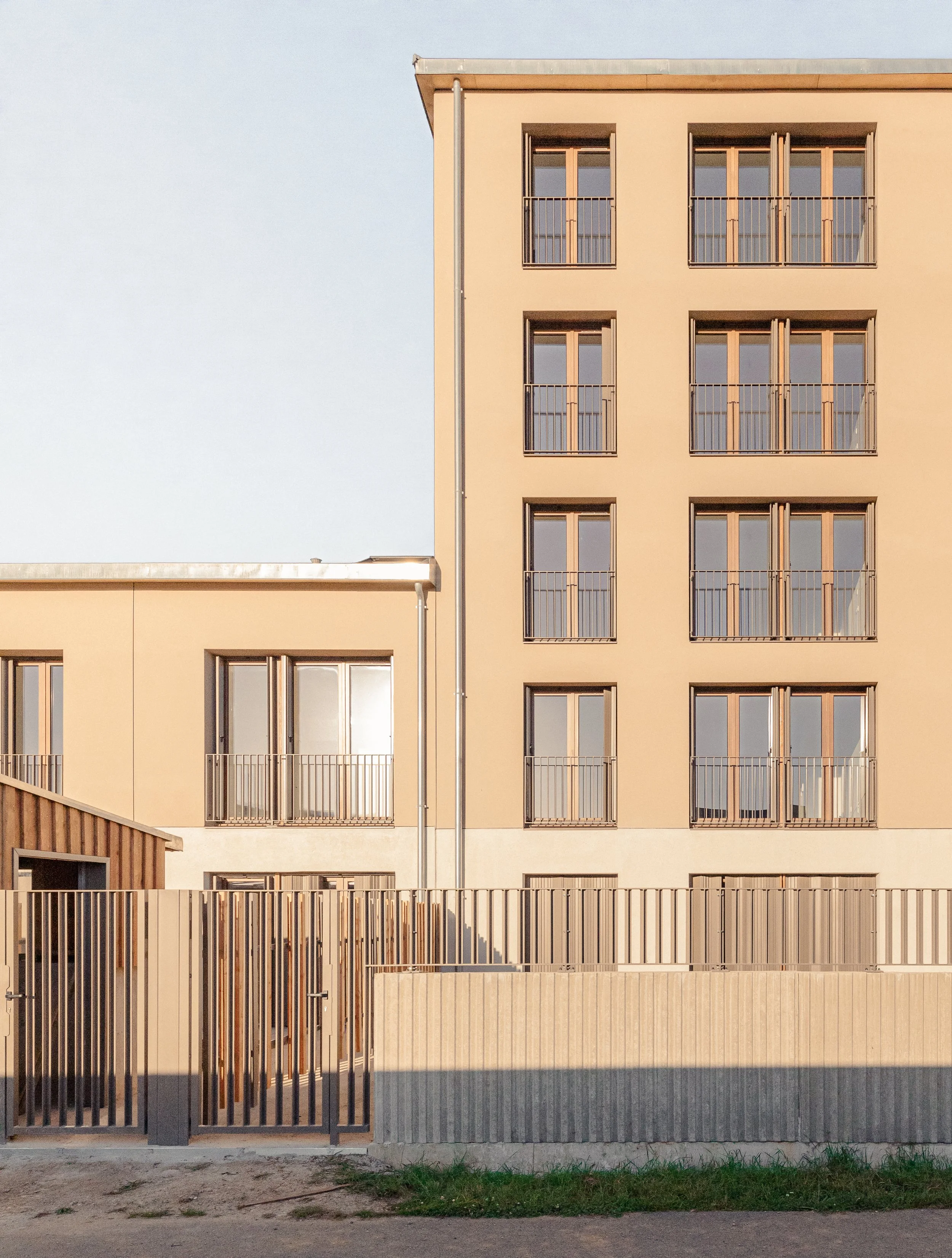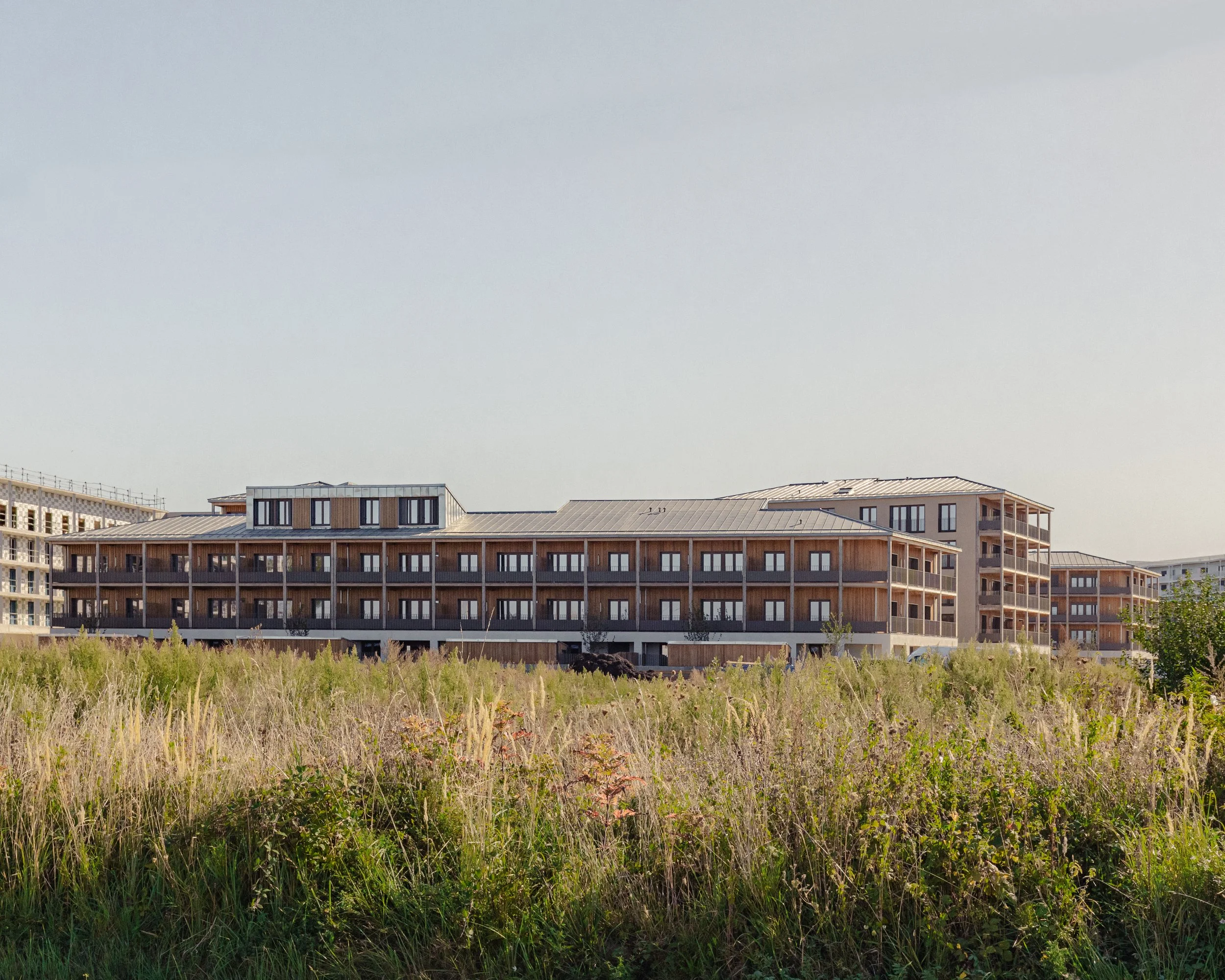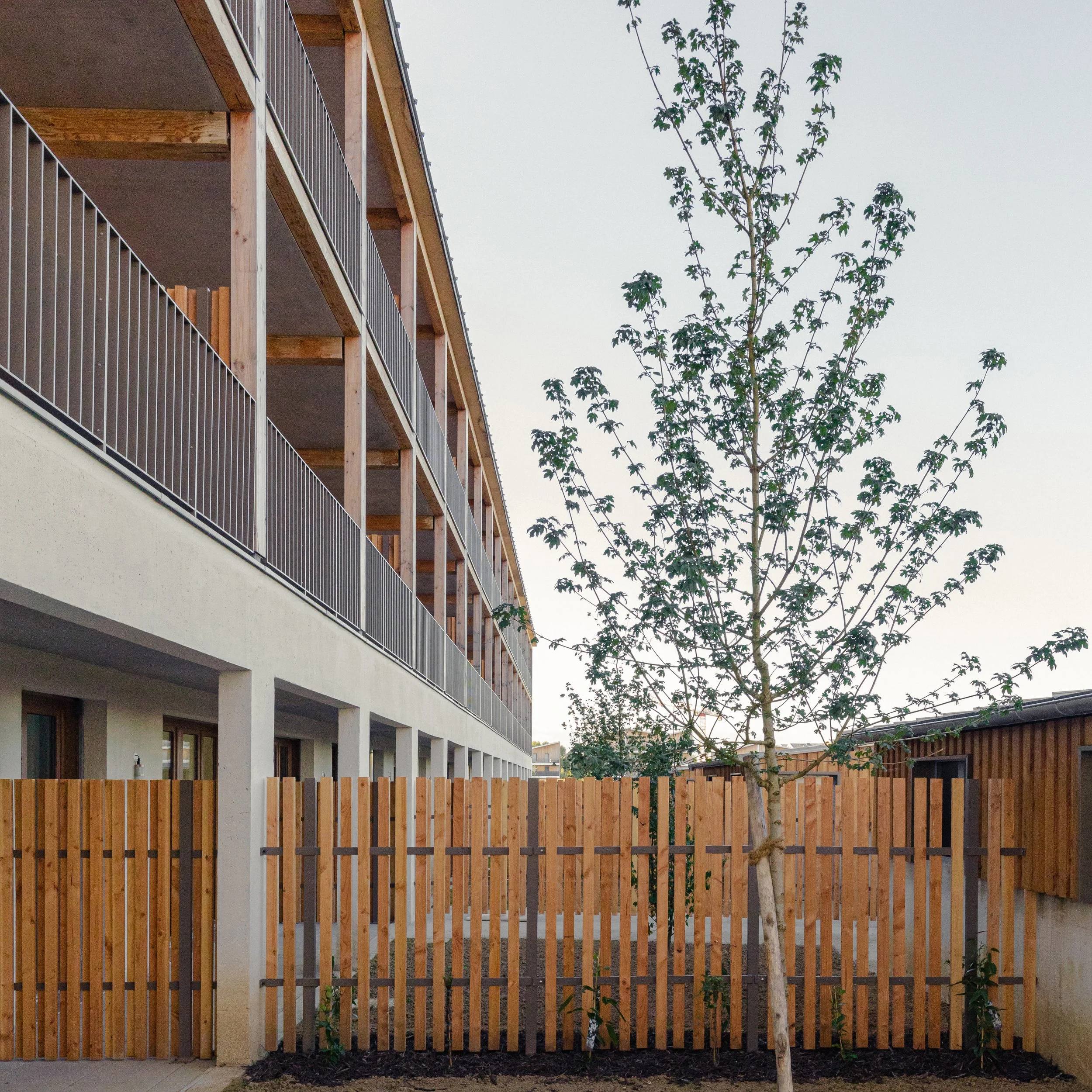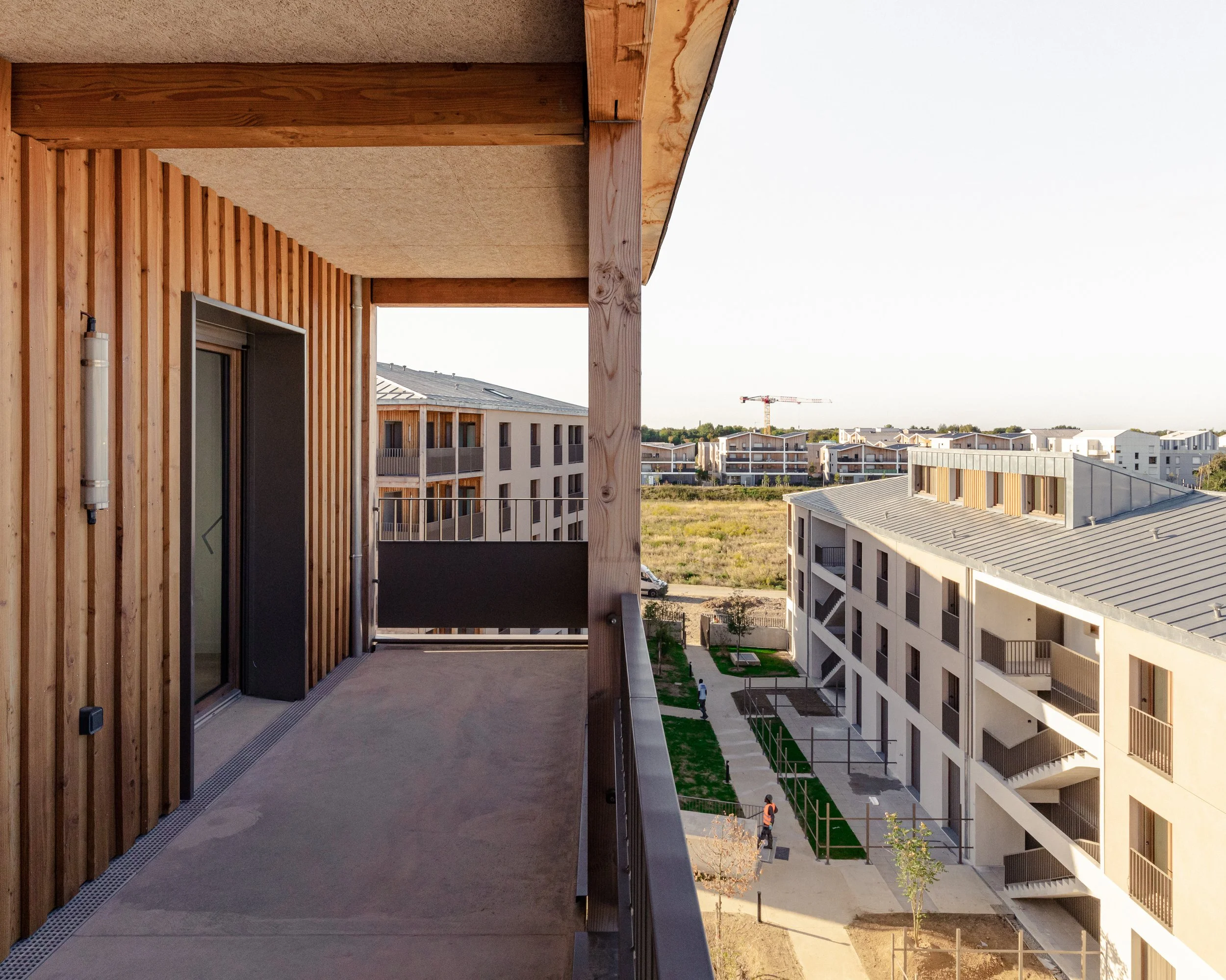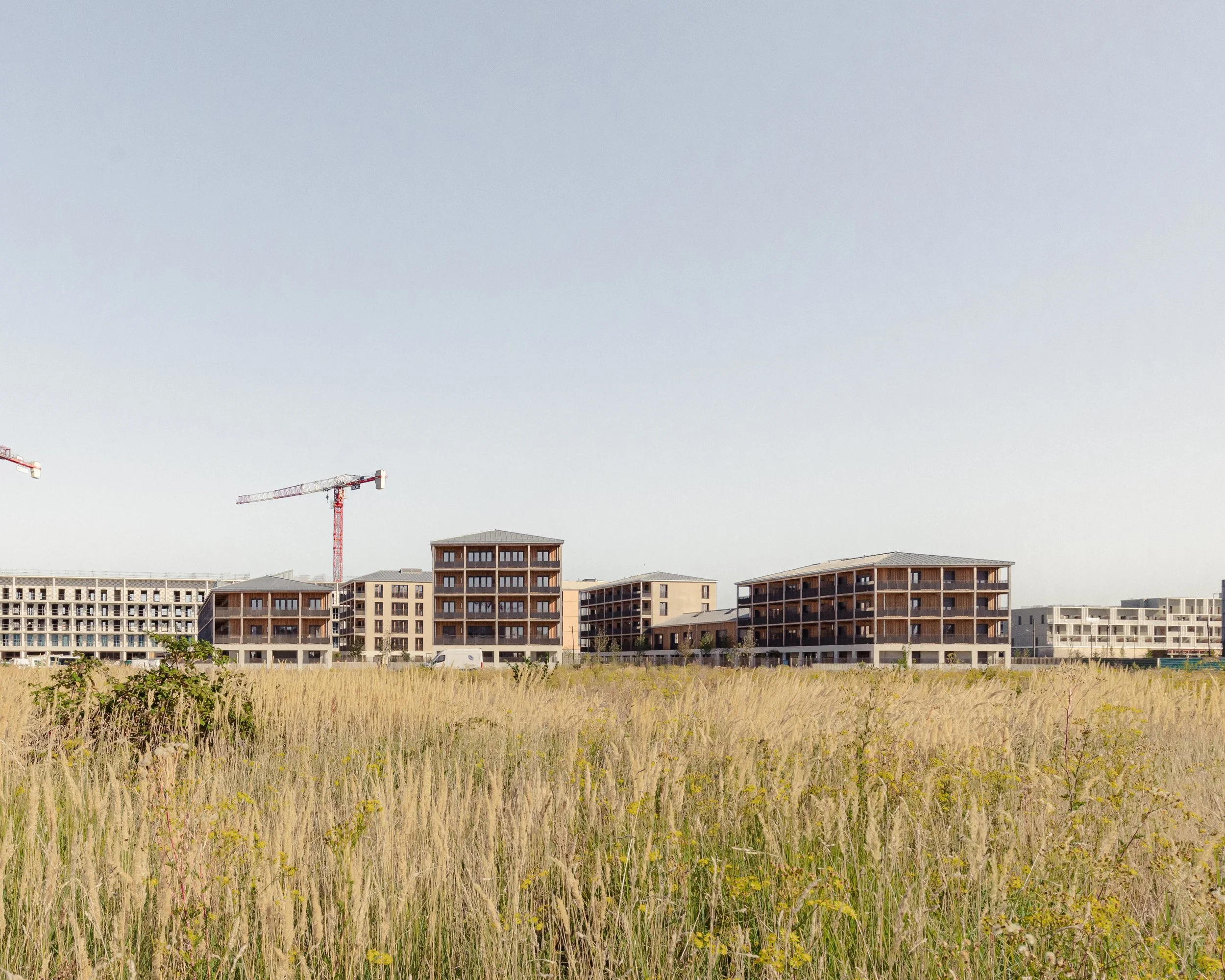 “ La conception des logements est guidée par les vues offertes sur ces grands espaces plantés à différentes échelles. Chaque logement possède un espace extérieur généreux d’au moins 15m². Un système de pièce de vie servante permet de supprimer les couloirs et d’offrir uniquement des m² utiles et habitables et des pièces de vies multi orientées et donc flexibles dans leurs utilisations. Le projet développe une identité architecturale à la fois domestique et unitaire pour l’ensemble des bâtiments aux hauteurs et échelles variées, organisée autour des espaces extérieurs en structure bois. ”