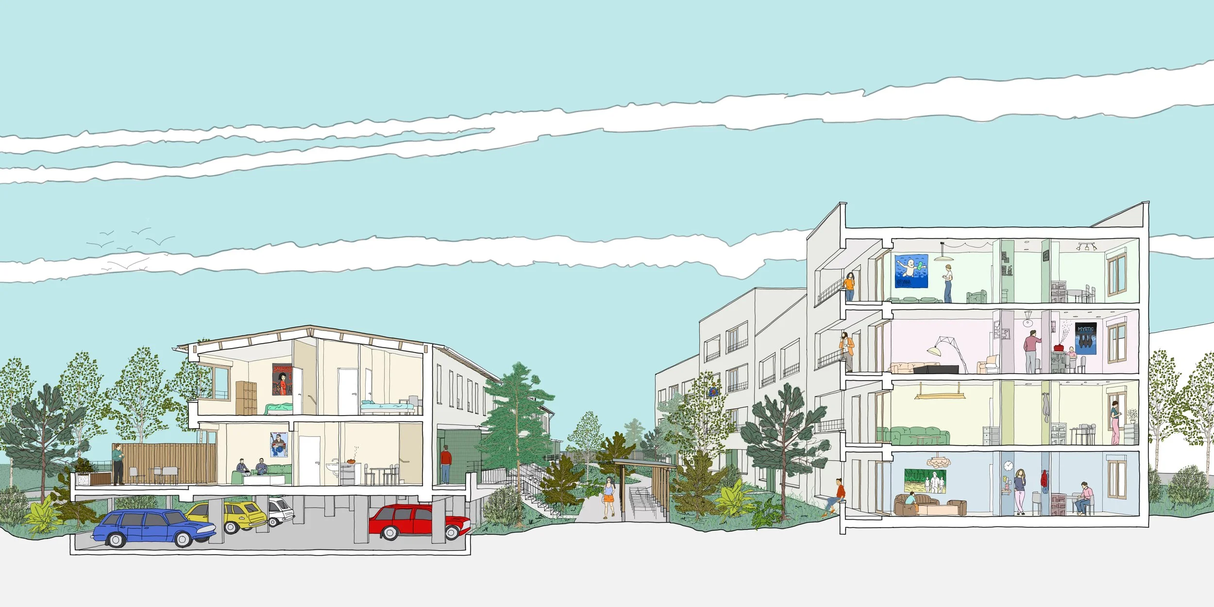 “ Le projet développe deux barrettes de logements aux typologies contrastées organisées autour d’un jardin en pleine terre. Au sud des maisons en bande posées sur un socle installé dans la pente intégrant le parc de stationnement semi enterrés. Dans le jardin un immeuble collectif en R+2 et R+3 desservi par quatre cage d’escalier éclairée naturellement et distribuant des logements tous traversant ou d’angle avec des espaces extérieurs généreux.”