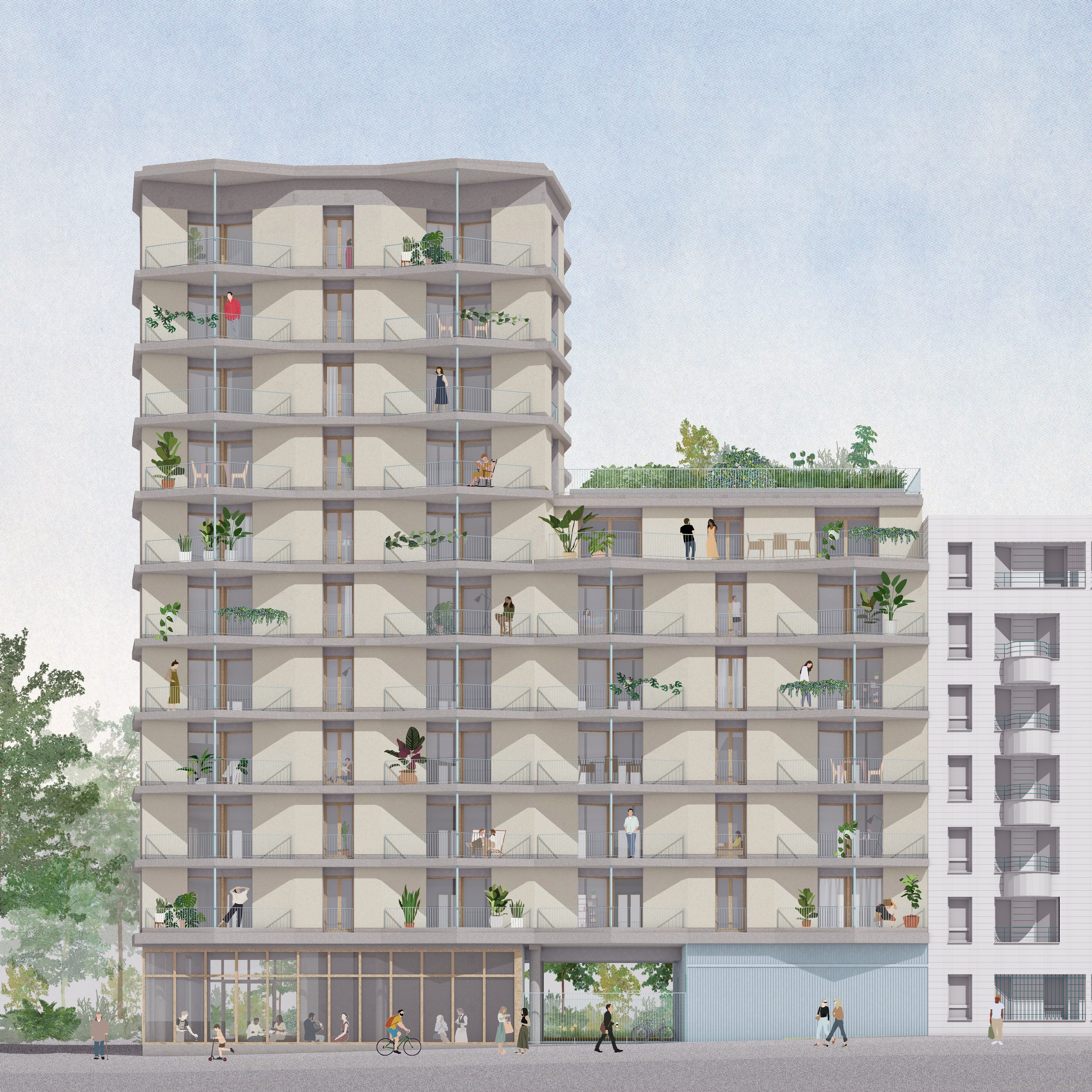 “ Le projet s’appui sur les ambitions constructive de la Zac Chapelle Charbon pour développer des façades en paille intégrée à des caissons bois préfabriqués en ateliers. Ce type de mise en œuvre constitue une innovation importante pour un immeuble d’habitation de 10 niveaux.”