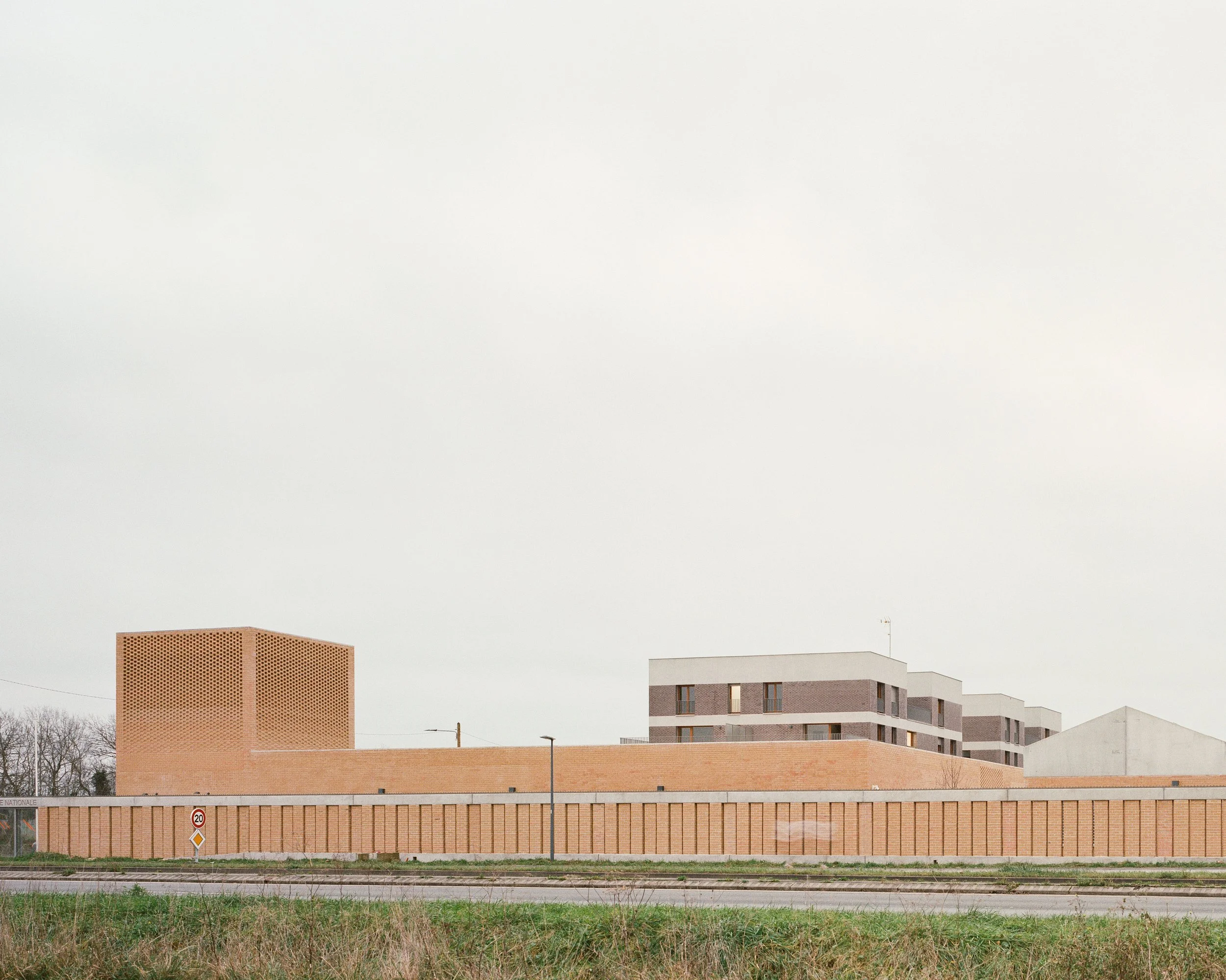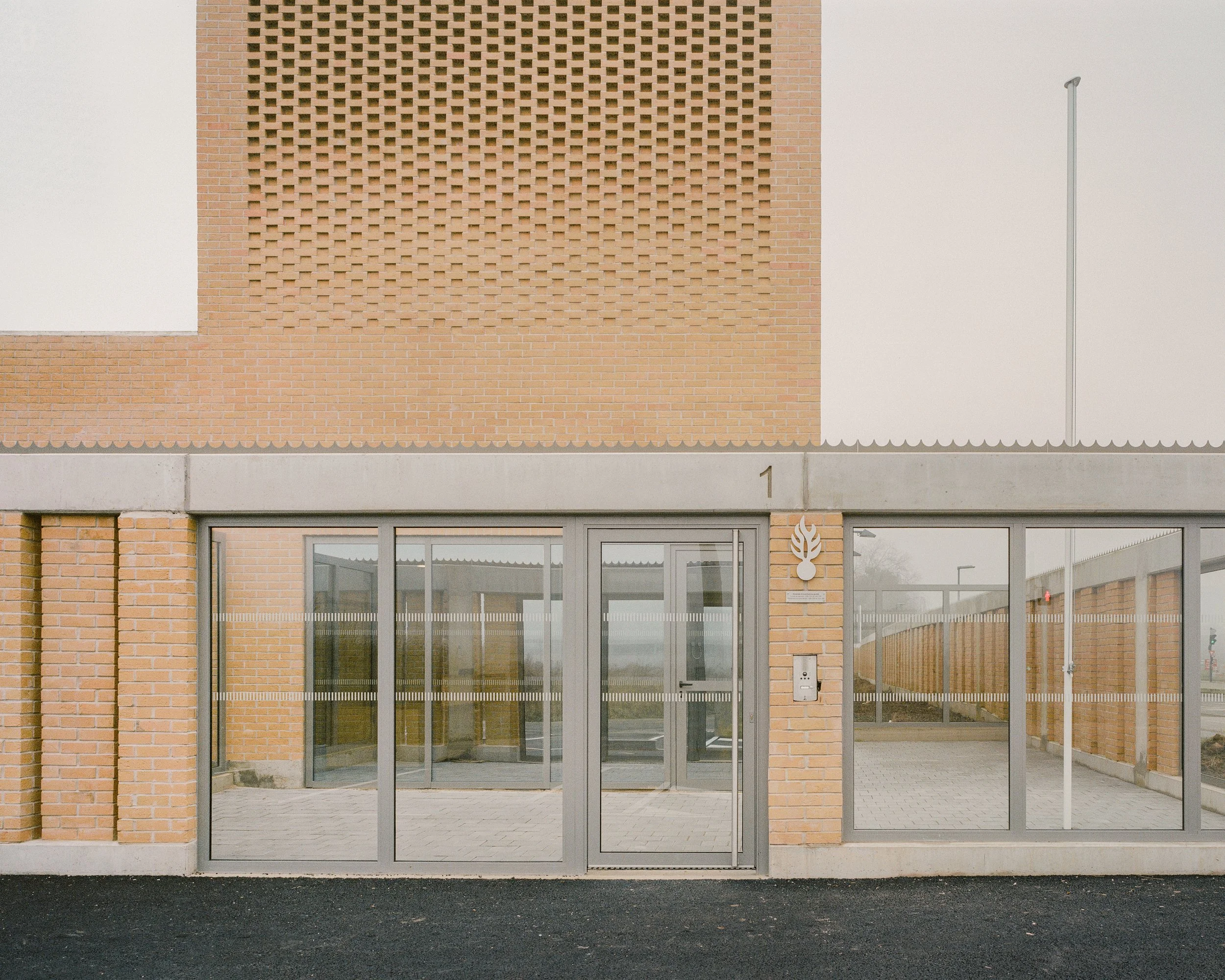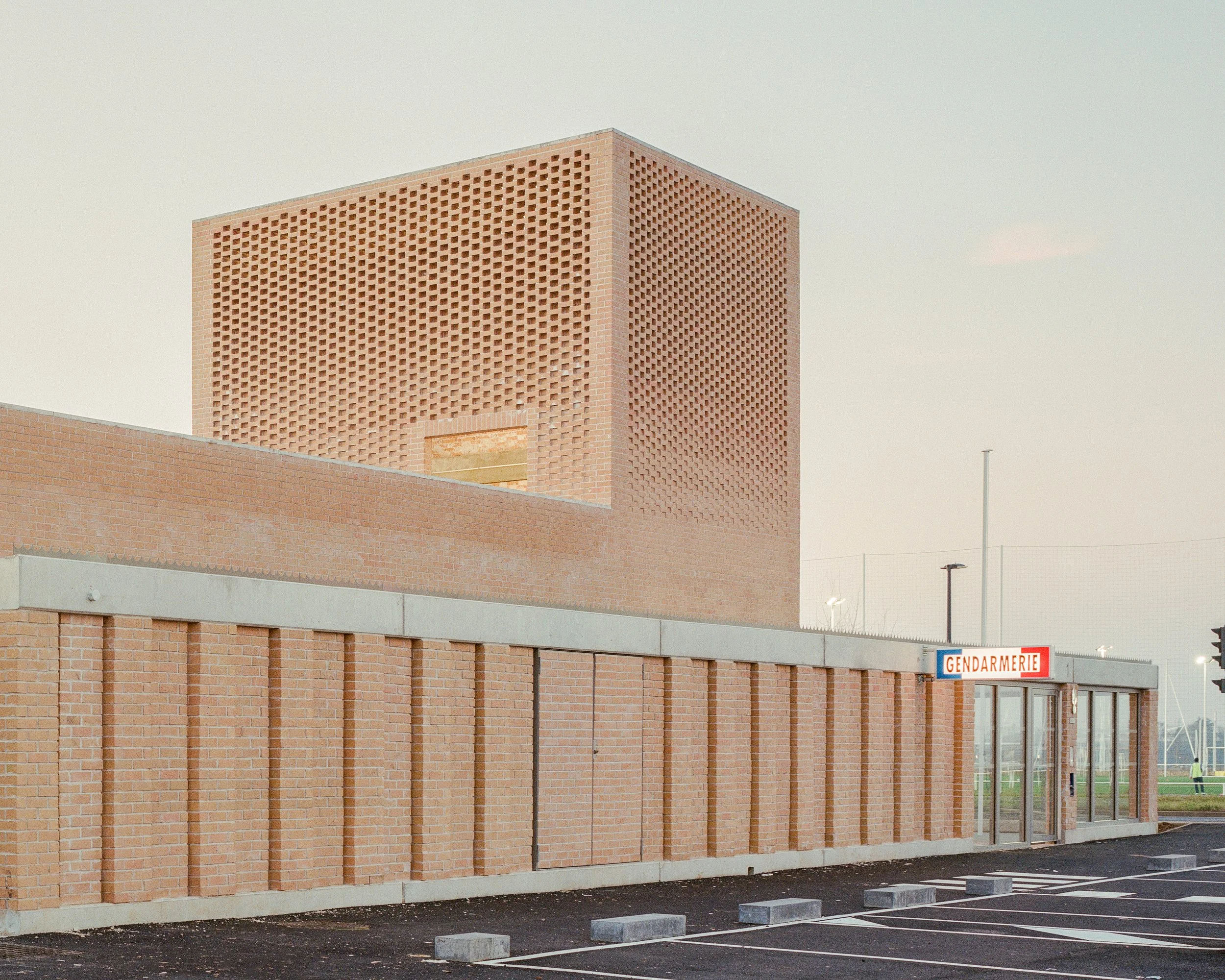 “ La caserne de gendarmerie de Gif-sur-Yvette est pensée comme un espace clos, domestique et paysagé. La question de la clôture sécuritaire est ici détournée pour devenir une véritable façade en brique structurelle filtrant le regard. Ce mode constructif est repris sur l’ensemble des constructions du projet comme alternative au béton et brique de parement.”