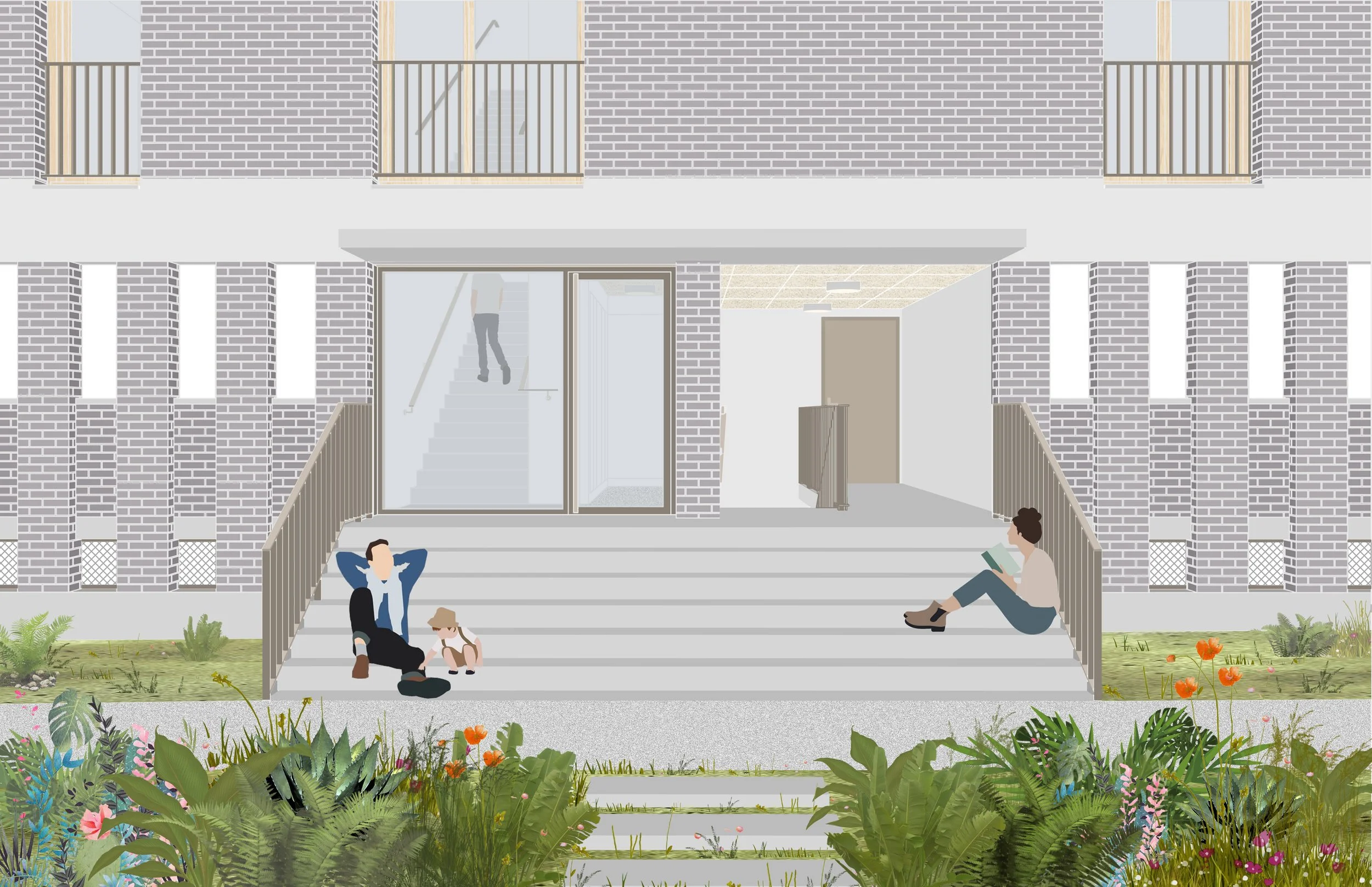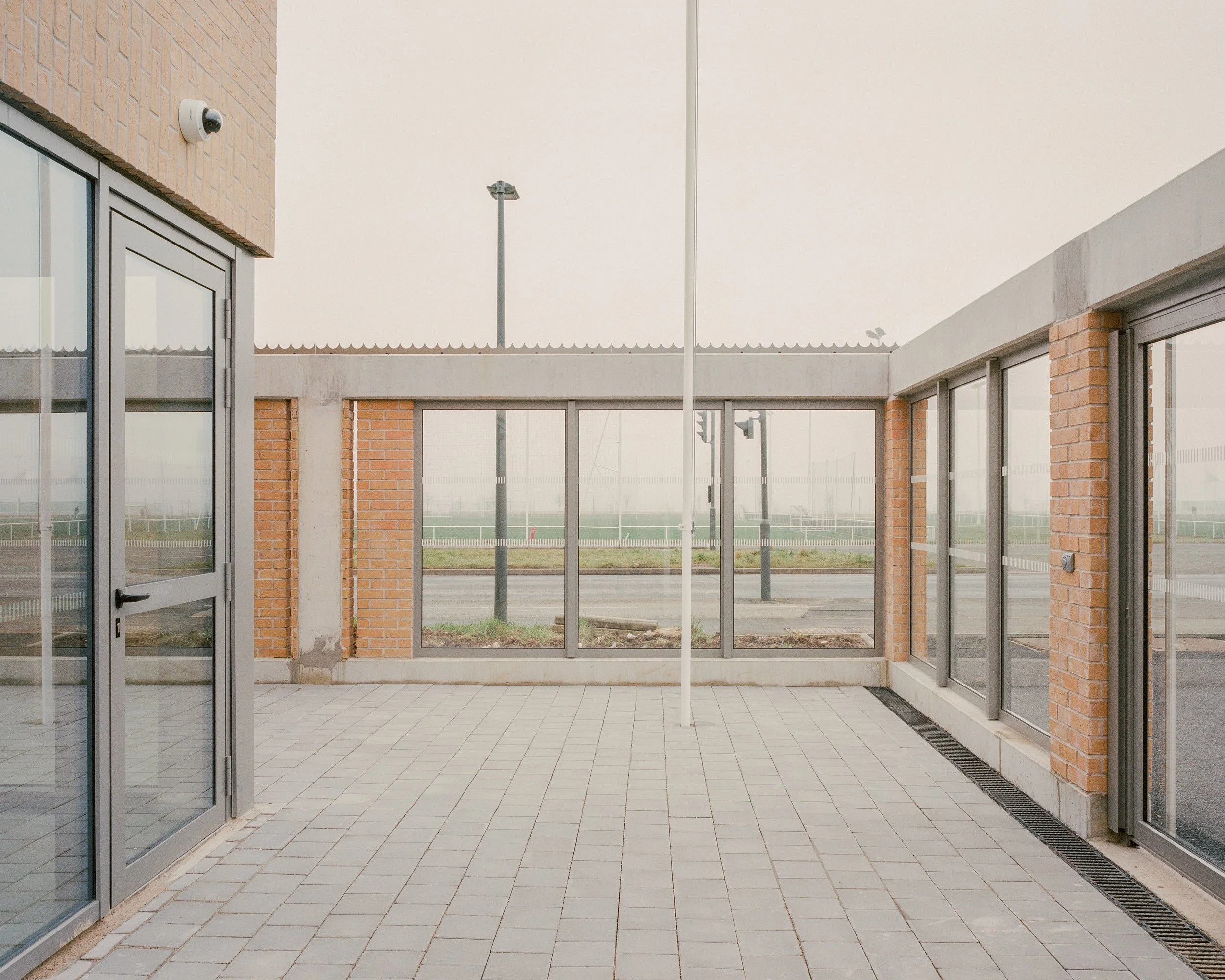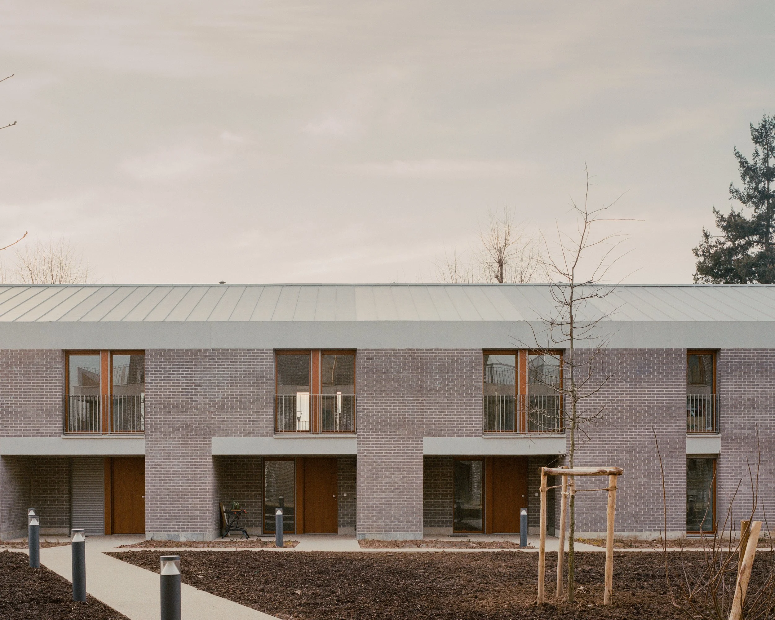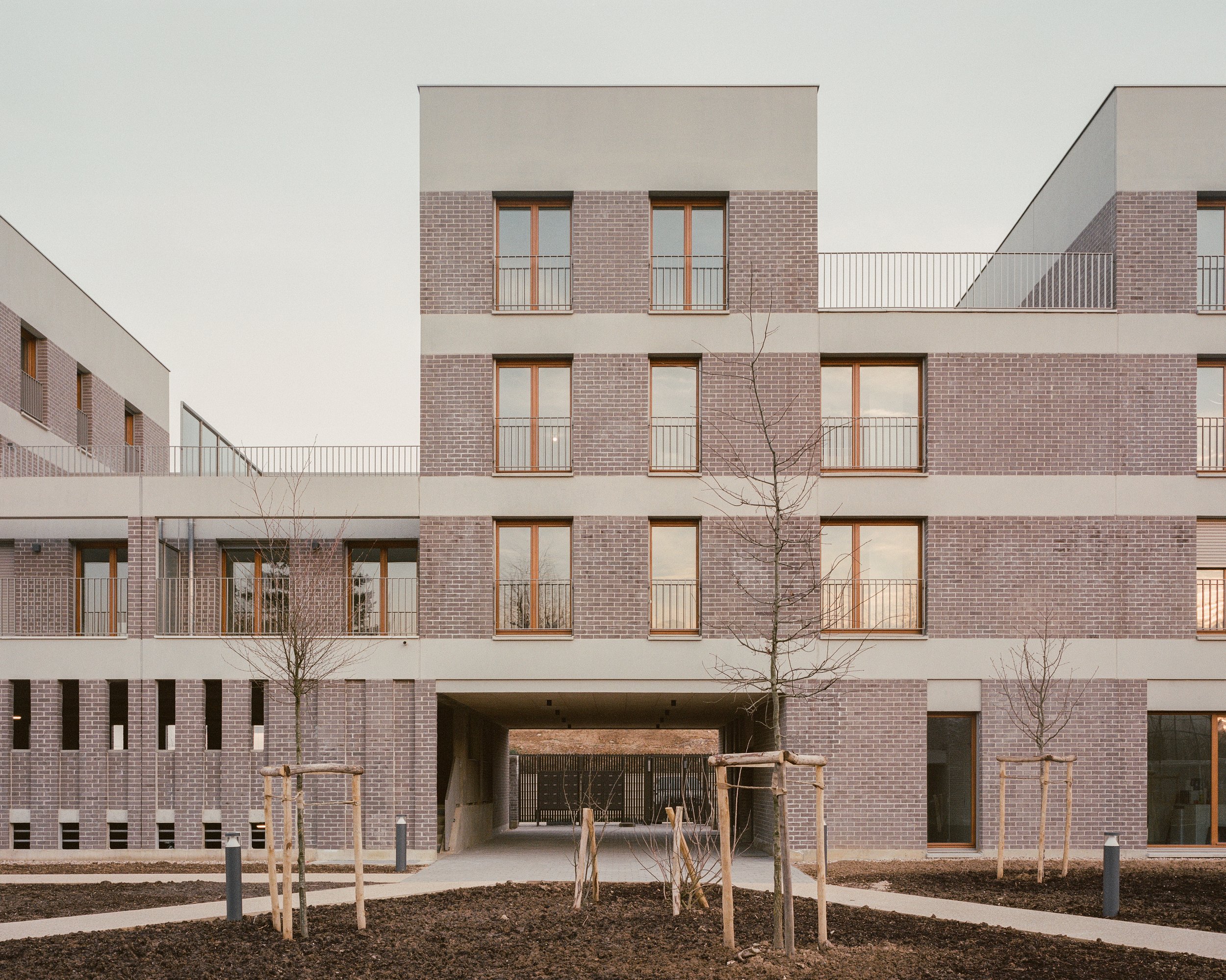 “ La caserne de gendarmerie de Gif-sur-Yvette est pensée comme un espace clos, domestique et paysagé. La question de la clôture sécuritaire est ici détournée pour devenir une véritable façade en brique structurelle filtrant le regard. Ce mode constructif est repris sur l’ensemble des constructions du projet comme alternative au béton et brique de parement.”