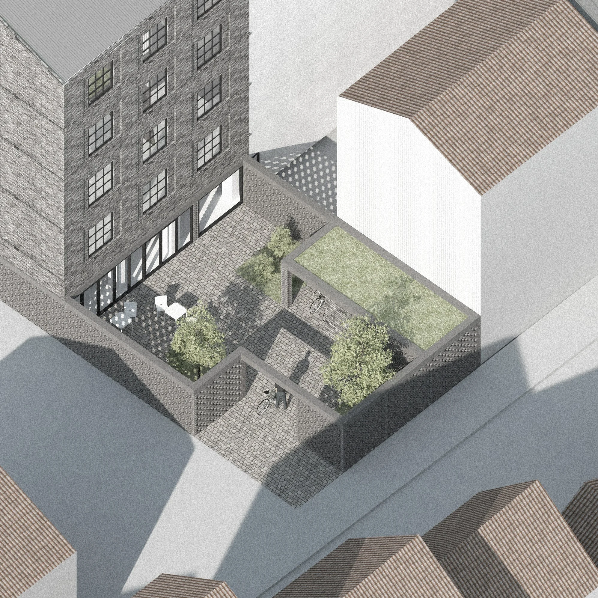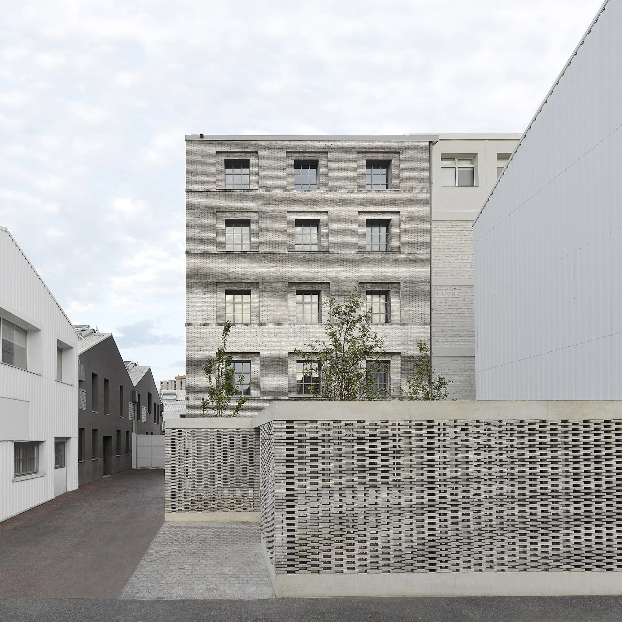 “ Ce projet est né d’une commande particulière : requalifier l’entrée d’un immeuble occupé par les ateliers Hermès à Pantin. Notre intervention est l’occasion de redéfinir le statut de ce délaissé urbain sous exploité en définissant ses contours. Nous avons pris le parti d’une clôture en moucharabieh de brique permettant ainsi de conserver la porosité visuelle depuis la rue Lesault tout en intégrant les locaux vélos et ordure ménagère de l’immeuble.”