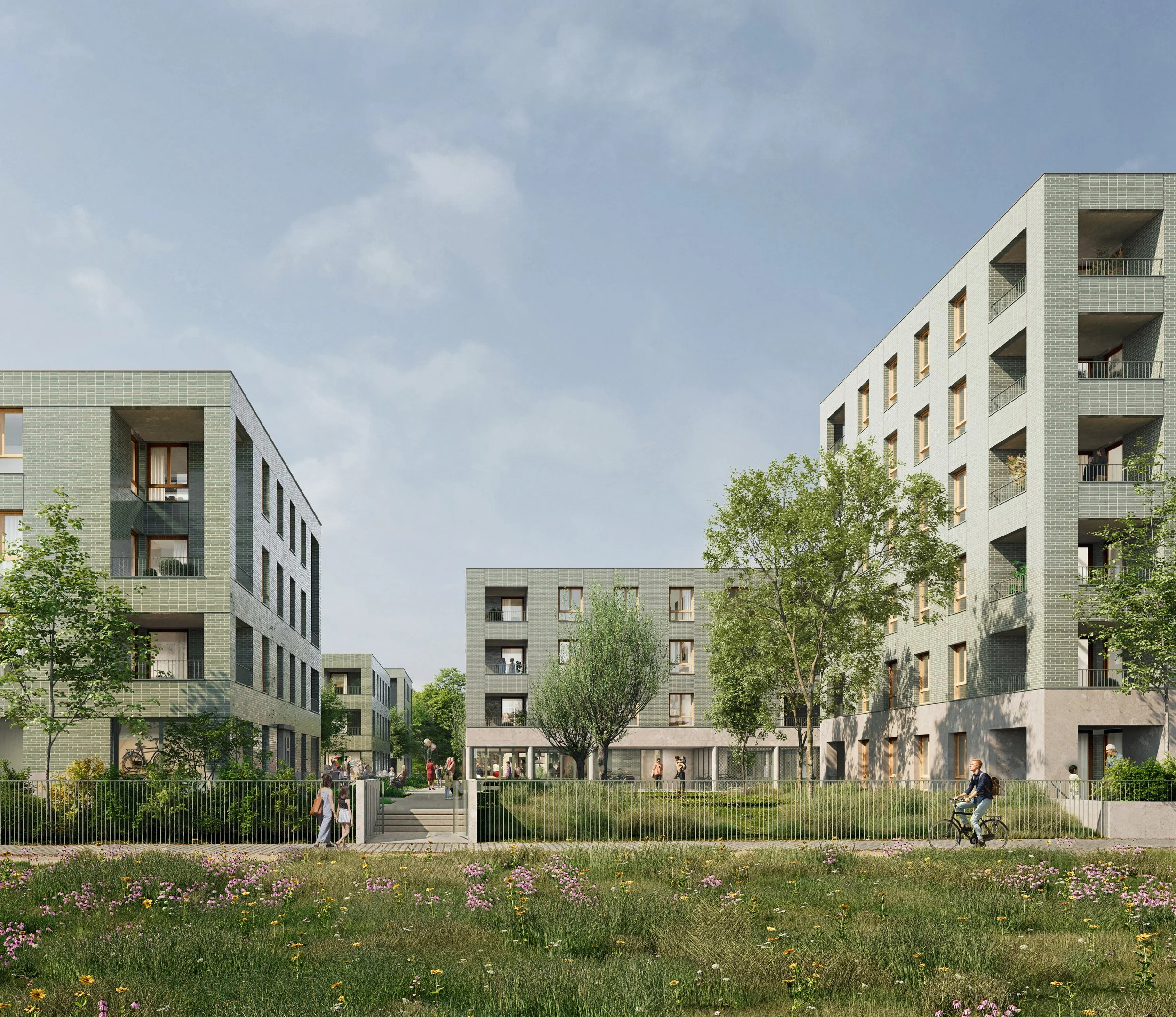 “ Le projet concentre le parking dans un socle sur double niveau au plus proche de la rue afin d’offrir aux habitants un cadre de vie dédié aux piéton et intégré dans un paysage de qualité. Les volumes s’implantent dans le jardin en quinconce selon une trame en damier et montent en hauteur depuis le parc vers la rue. Tous les logements profitent d’une double orientation et d’un espaces extérieur généreux abordée comme une vraie pièce en plus.”