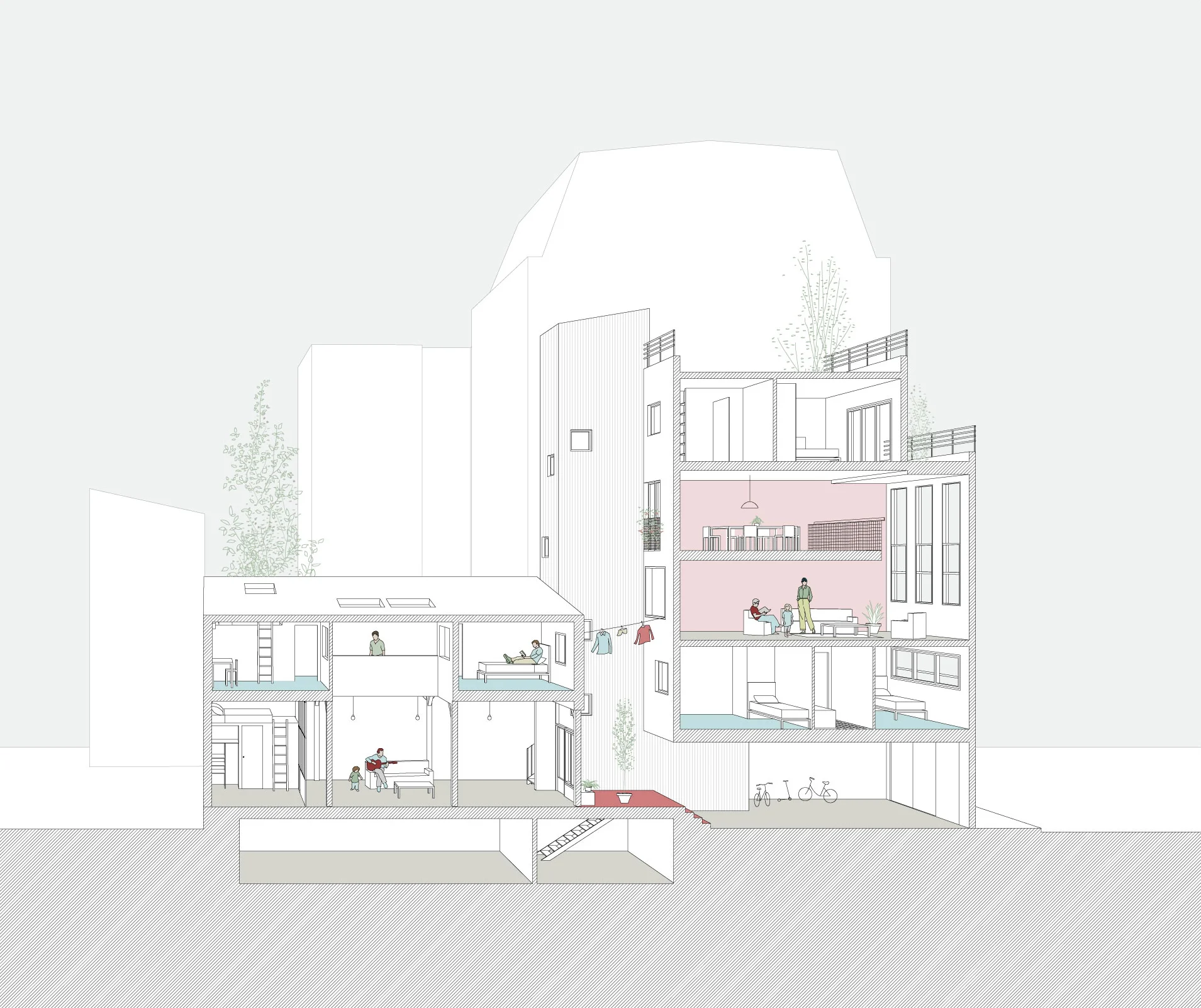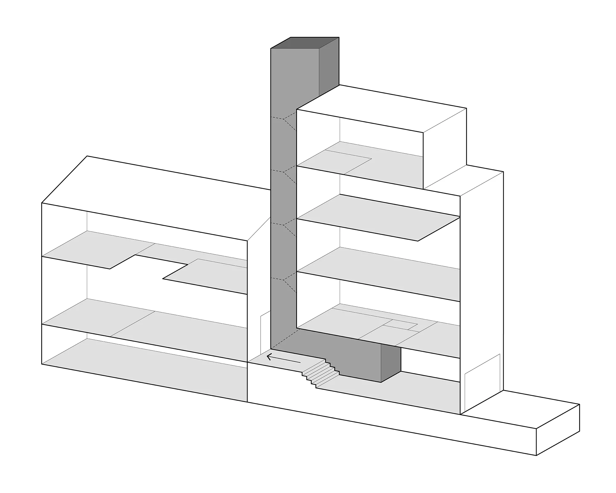 Le parti pris du projet consiste à réaliser une “tourette escalier” dans la cour, capable de vider les deux bâtiments de l’ensemble des escaliers existants et de relier physiquement les deux volumes pour devenir une seule maison familiale.